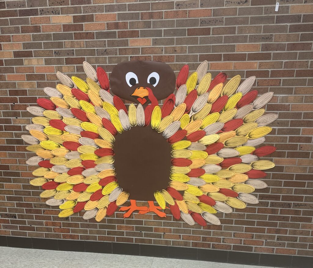 That focus took visible form around Thanksgiving, when students and staff created a Thankful for Kindness Turkey in the lunchroom. Each feather named a person in the school and described a kindness that person had shown. The display turned small, everyday moments into something students could stop, read, and remember.