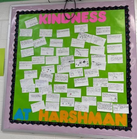 At Harshman, kindness means “doing what you can for others to make a positive impact on our world,” and this isn’t just a platitude on a poster. In advisory, every class developed its own definition of kindness, filling notecards with words, images, and phrases that reflected their experiences. Student council members then sorted through the submissions, identified common themes, and shaped them into a shared definition. The result now lives in the cafeteria as a neon green bulletin board — a central visual made up of hundreds of student voices, all contributing to what kindness looks like in their community.