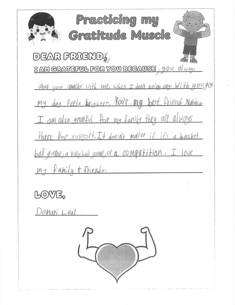 The school runs daily and weekly kindness challenges through the morning announcements: compliment someone, thank someone for something specific, help someone without being asked. At lunch and recess, the staff sees the results. “You hear it,” Frias says. “They’ll tell you, ‘Miss, I love your earrings today,’ or ‘Thank you for opening the door.’ The kids are learning that.”